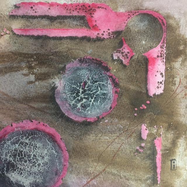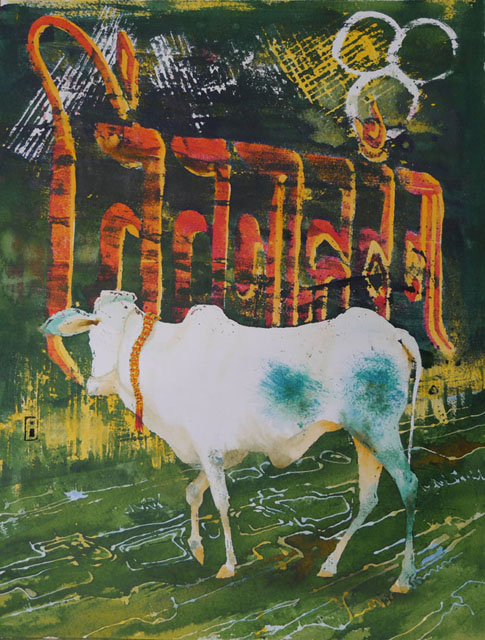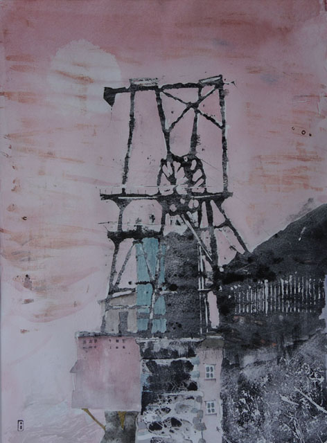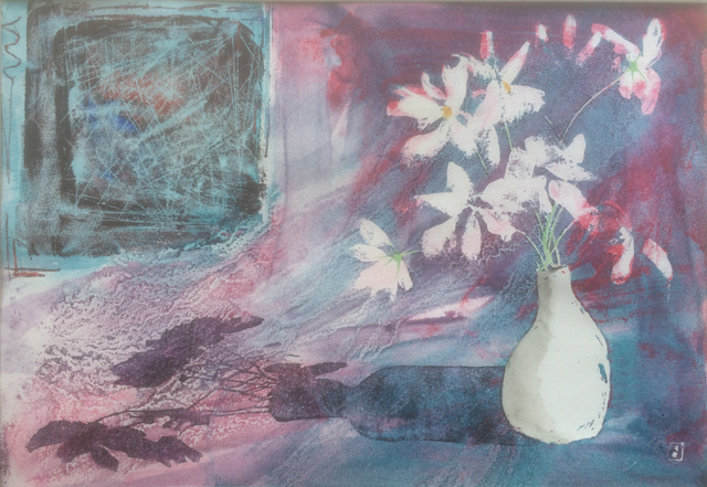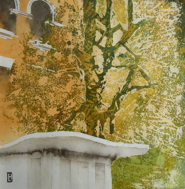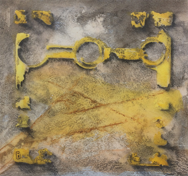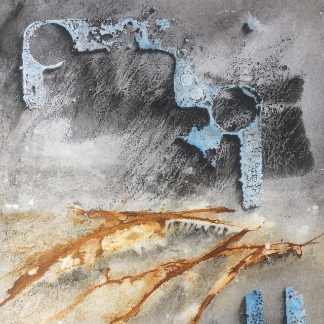 Paintings now incorporate elements of dry-point printing, lino-cut and monoprint.