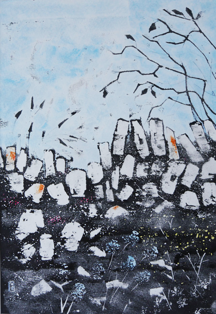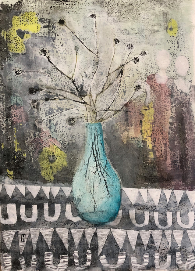 Paintings now incorporate elements of dry-point printing, lino-cut and monoprint.